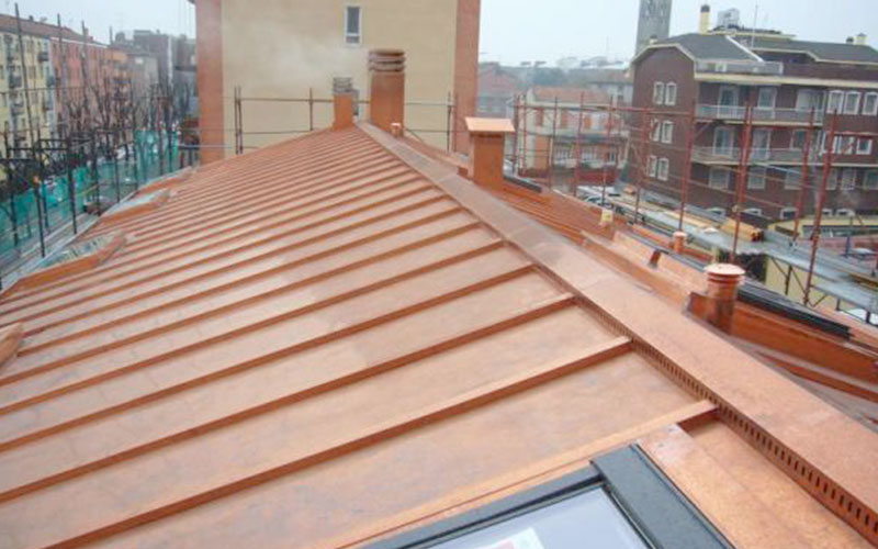 Copertura in rame spessore 6/10, in lastre a bacinella, giuntate lateralmente a giunto a listello,